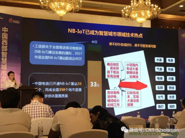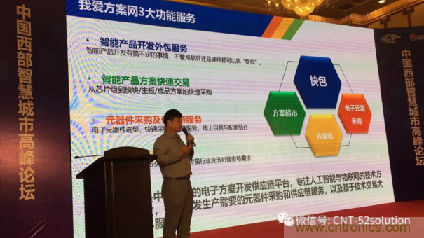 为服务西部产业创新,中电网络技术/我爱方案网携手四川本地技术服务商与中国电子信息博览会来到成都,我爱方案网的CEO刘杰博士在2018中国智慧城市高峰论坛做大会报告,围绕“AI支撑智慧城市和IoT技术方案发展”做了主题讲演,分别介绍了AI发展路径;通过大数据分析AI应用市场需求市??;解读了AI处理器推动边缘计算;列举了大量AI物联网方案开发案例,引起论坛参会人员的深度思考。