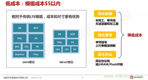 黄总总结了三个原因:射频相对比较简单,它没有滤波器,它是单天线的方案,这个和用4G来做物联网的技术是有明显的差别。第二是基带比较简单,第三是简化的协议。