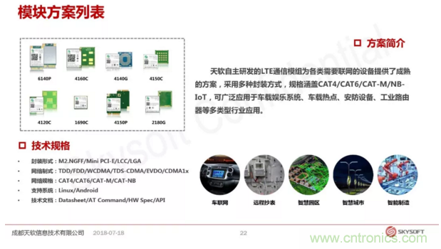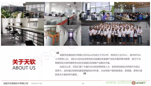天软信息成立于2014年,现有员工近150人,其中80%为研发人员。公司以成为全球领先的无线通信及智能产品技术提供商为愿景,致力于为物联网及车联网提供专业的无线通讯及智能产品解决方案。Skysoft是西部为数不多的拥有独立综合通信测试实验室,并能提供LTE终端产品/??椤⑽尴呗酚善?、车载通信及多媒体等软硬件研发能力的高新技术企业。