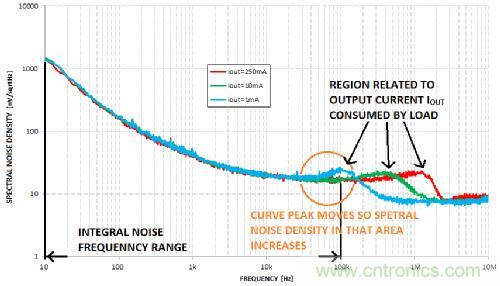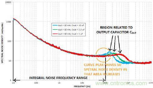 但是,如何表示LDO输出的噪声有多大呢?可用如上文所示的积分噪声频率范围表示。这个范围通常是10赫兹至100千赫。