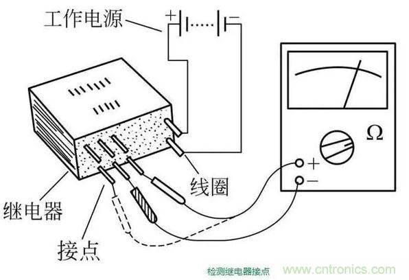 给继电器线圈接上规定的工作电压,用万用表“Rx1K”档,检测节点的通断情况。
