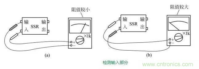 检测固态继电器时,将万用表置于“Rx1K”档,分别检测其输入部分和输出部分。