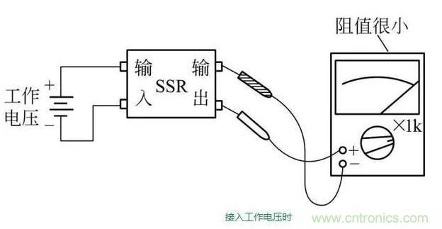 在上一步检测的基础上,给固态继电器输入端接入规定的工作电压,这时固态继电器输出端两引脚之间应该导通,万用表表针指示阻值很小。