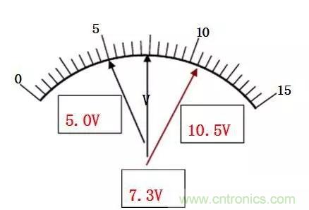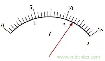 若是0~15V档,最小分度值为0.5V, 半格为0.25V,通??晒蓝廖?.2V或0.3V。(因有效数字出现在以V为单位的十分位上)。图中读数应为 11. 2V或11.3V。