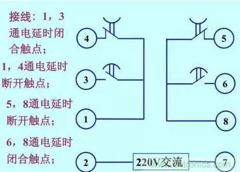 6-8脚为通电延时断开触点,接通电源,给了信号之后线圈得电,等到设置时间到达以后,触点断开;