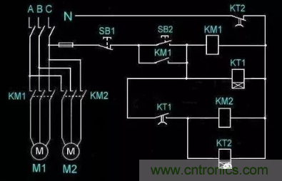 各个引脚的含义我们已经搞清楚了,下面就可以根据控制原因进行接线,我们以下图为例,在电路中加入KT通电延时时间继电器,当按下启动按钮SB2线圈KT1、KM1得电交流接触器KM1吸合,电动机M1转动,延时闭合开关KT1到达时间吸合,KM2、KT2得电,交流接触器KM2得电吸合,电动机M2转动,延时断开开关KT2在到达时间以后断开,整个控制回路断开,所有电机停止转动;