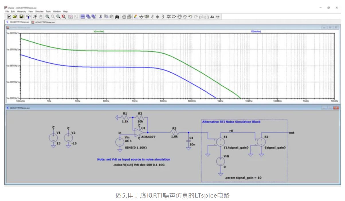 LTspice的多功能性和准确性使其对噪声仿真非常有用。输出节点和输入源在噪声仿真命令中指定,输出噪声(RTO)是查看分析结果的默认方式。LTspice还会根据RTI的传统定义计算参考到指定输入源的输入噪声,但如图4所示,对传统RTI噪声进行积分无法提供有意义的结果。图5显示了如何在LTspice的输出中添加一级,以便仿真器返回替代的虚拟RTI噪声。运行仿真后,在选定图形的情况下,从Plot Settings—Add Trace将输入噪声添加到图形中,然后选择V(inoise)。这会将输入噪声添加到图形中。曲线形状与输出噪声相匹配,表明整个电路的频率响应都得到了考虑。在按住ctrl键的同时左键单击图形中标题为"V(inoise)"的曲线,以对总RTI噪声进行积分。