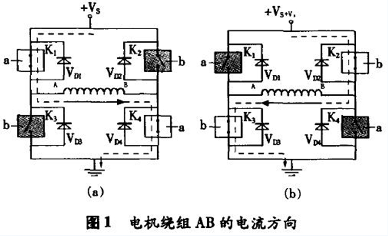 4个开关K1和K4,K2和K3分别受控制信号a,b的控制,当控制信号使开关K1,K4合上,K2,K3断开时,电流在线圈中的流向如图1(a),当控制信号使开关K2,K3合上,K1,K4断开时,电流在线圈中的流向如图1(b)所示。4个二极管VD1,VD2,VD3,VD4为续流二极管,它们所起的作用是:以图1(a)为例,当K1,K4开关受控制由闭合转向断开时,由于此时线圈绕组AB上的电流不能突变,仍需按原电流方向流动(即A→B),此时由VD3,VD2来提供回路。因此,电流在K1,K4关断的瞬间由地→VD3→线圈绕组AB→VD2→电源+Vs形成续流回路。同理,在图1(b)中,当开关K2,K3关断的瞬间,由二极管VD4,VD1提供线圈绕组的续流,电流回路为地→VD4→线圈绕组BA→VD1→电源+Vs。步进电机驱动器中,实现上述开关功能的