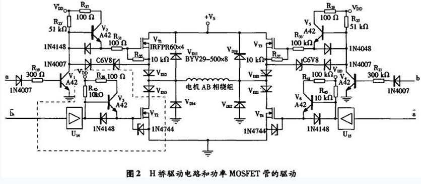 功率MOSFET管有内接的快恢复二极管。当不接VD11,VD12,VD13,VD14时,假定此时电机AB相绕组由VT1管(和VT4管)驱动,即VT2管(和VB)截止,VT1管(和VT4管)导通,电流经VT1管流过绕组。当下一个控制信号使VT1管关断时,负载绕组的续流电流经VT2的内接快恢复二极管从地获取。此时,VT2管的漏源电压即是该快恢复二极管的通态压降,为一很小的负值。当VT1再次导通时,该快恢复二极管关断,VT2的漏源电压迅速上升,直至接近于正电源的电压+VS,这意味着VT2漏源间要承受很高且边沿很陡的上升电压,该上升电压反向加在VT2管内的快恢复二极管两端,会使快恢复二极管出现恢复效应,即有一个很大的电流流过加有反向电压的快恢复二极管。为了抑制VT2管内的快恢复二极管出现这种反向恢复效应,在图2电路中接人了VD11,VD12,VD13,VD14。其中,反并联快恢复二极管VD11,VD14的作用是为电机AB相绕组提供续流通路,VD12,VD13是为了使功率MOSFET管VT1,VT2内部的快恢复二极管不流过反向电流,以保证VT1,VT2在动态工作时能起正常的开关作用。VD19,VD20,VD21,VD22的作用亦是同样的道理。