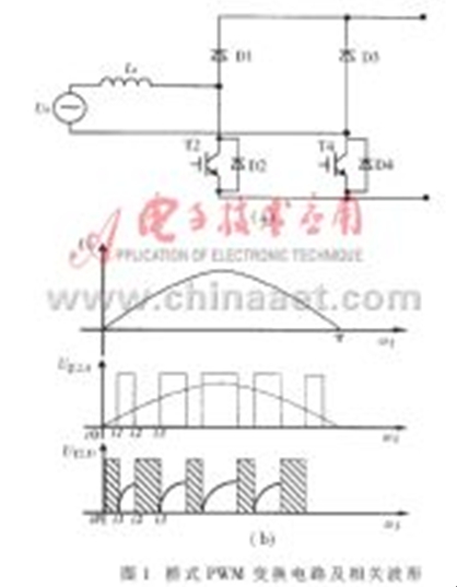 图1(a)所示为工作在PWM整流状态的H型桥式PWM变换电路(此图为正弦波正半波输入下的等效电路,上半桥的两只IGBT未画出),图1(b)为下半桥两只大功率器件的驱动信号和相关的器件波形。现以正半波工作过程为例进行分析(对于三相PWM电路,在整流、逆变工作状态或单相DC/DC工作状态下,PWM电路的分析过程及结论基本类似)。