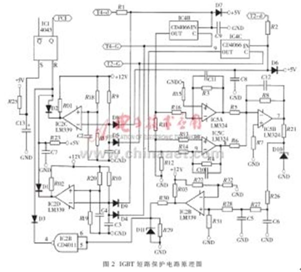 由对图1所示电路的分析,可以得到IGBT短路?;さ缏返脑淼缏吠?如图2所示。在图2所示电路中, IC4及其外围器件构成选通逻辑电路,由IC5及其外围器件构成滤波及放大电路,IC2及其外围器件构成门限比较电路,IC1及其外围器件构成保持电路。正常情况下,D1、D2、D3的阴极所连接的IC2D、IC2C及CD4011的输出均为高电平,IC1的输出状态不会改变。假设由于某种原因,在给T2发驱动信号的时候,H型桥式PWM变换电路的左半桥下管T2的管压降异常升高(设电平值为“高”),即T2-d端电压异常升高,则该高电平UT2-d通过R2加在D8的阴极;同时,发给T2的高电平驱动信号也加在二极管D5的阴极。对IC2C来说,其反相输入端为高电平,若该电平值大于同相输入端的门槛电平值的话,则IC2C输出为“低”。该“低”电平通过D2加在R-S触发器IC1的R输入端,使其输出端Q的输出电平翻转,向控制系统发出IGBT故障报警信号。如果是由于右半桥下管T4的管压降异常升高而引起IC2D输出为“低”,则该“低”电平通过D1加在R-S触发器IC1的R输入端,使其输出端Q的输出电平翻转,向控制系统发出IGBT故障报警信号。由IC5A和IC5C及其外围器件构成的滤波及放大电路将选通电路送来的描述IGBT管压降的电压信号进行预处理后,送给由IC5B构成的加法器进行运算处理。若加法器的输出电平大于由R22和R32确定的门槛电平,则会使R-S触发器IC1的R端的第三个输入端为“低”,也向控制系统发出IGBT故障报警信号。改变由R22和R32确定的门槛电平,就可以灵活地改变这第三路报警信号所代表的物理意义,从而灵活地设计?;さ缏贰M?中的端子T4-d、T2-d,分别接在T4、T2的集电极上,T4-G、T2-G分别接IGBT器件T4、T2的驱动信号。在电路设计时应该特别注意的是,D8、D5、D9、D4必须采用快速恢复二极管。