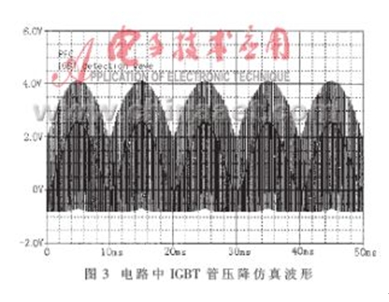 当图1所示的PWM变换器工作在单相高频整流模式下,应用PSPICE仿真软件对图2所示的电路进行仿真研究,可以得到如图3所示的结果。图3所示的仿真波形相当于在图2电路中IC5B的第7脚观察到的信号波形。仿真结果表明,检测电路可以快速、有效地将PWM变换器的下管导通时的管压降检测出来。图4所示波形是实际电路工作时检测到的相关波形。图中,1#通道显示的是单相高频整流电感电流的给定波形,2#通道显示的是实际检测到的图2电路中IC5B的第7脚的工作波形。比较图3和图4可以得出,该检测电路可以快速、有效地检测出IGBT导通时的管压降,从而对IGBT实施有效的?;?。