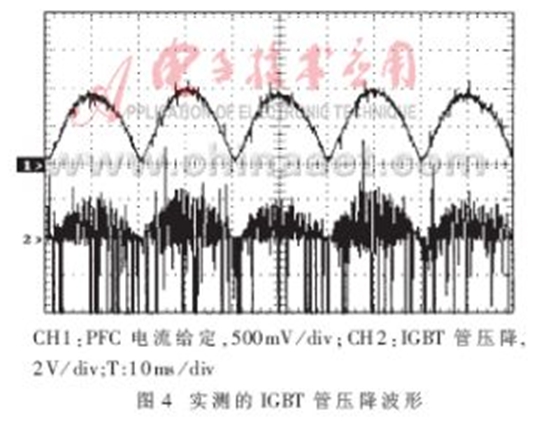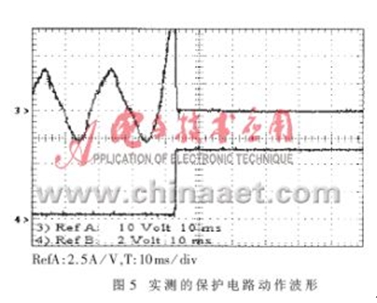 图5所示为IGBT过流时实际检测到的PFC电感中流过的电流及保护电路动作的波形。
