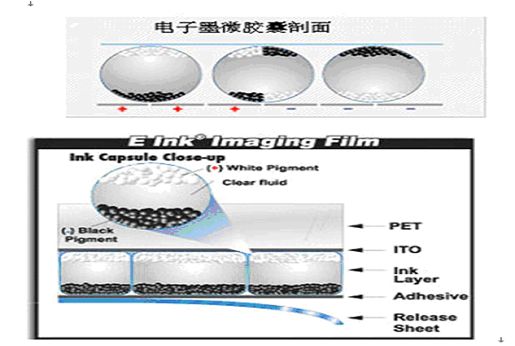 E-Ink的电子纸由电子墨水及两片基板所组成:第一部分是电子墨水,有时被称为“前基板(front plane)”;二是使电子墨水生成文本和图像所需要的电子设备组合,包括控制部分和显示部分,被称为“背基板(backplane)”。背基板上面涂有由无数微小的透明颗粒组成的电子墨水,颗粒直径只有人的头发丝的一半大小。电子墨水是一种加工成薄膜状的专用材料,与电子显示设备结合在一起使用,是化学、物理学和电子技术的综合应用。电子墨水由数百万个尺寸极小的微胶囊构成,直径与头发丝相当。每一个微胶囊中含有带正电荷的白色粒子和带负电荷的黑色粒子,它们悬浮在清洁的液体中。 如图1所示,电子墨水薄膜的顶部是一层透明材料,作为电极端使用;底部是电子墨水的另一个电极,微胶囊夹在这两个电极间。微胶囊受负电场作用时,白色颗粒带正电荷而移动到微胶囊顶部,相应位置显示为白色;黑色颗粒由于带负电荷而在电场力作用下到达微胶囊底部,使用者不能看到黑色。如果电场的作用方向相反,则显示效果也相反,即黑色显示,白色隐藏??杉?,只要改变电场作用方向就能在显示黑色和白色间切换,白色部位对应于纸张的未着墨部分,而黑色则对应着纸张上的印刷图文部分。