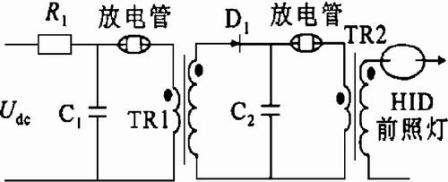 启动期间,电子镇流器要经历高压击穿、电流接续、预热维弧3个阶段。高压启动电路是HID 前照灯能否瞬间点亮的基础。但辉光放电后惯性和滤波延迟使直流变换器和检测回路很难有较快的响应速度,所以需要如图1所示的电流接续(take-over) 电路,它可利用电容预先储存的能量为灯提供一个较大的瞬间电流(约300ms) ,保证辉弧可靠过渡。一般高压发生电路有以下几种: