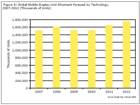 图5所示为iSuppli公司对于2007-2012年手机显示器市场的预测。