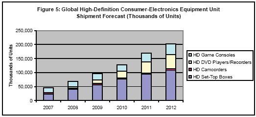 - 到2012年, 52.9%的付运机顶盒、摄像机、DVD播放机和游戏机都会支持高清晰度,2008年只有21.6%