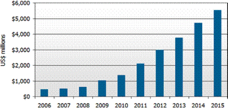 图一 : 2006-2015 全球OLED面板出货金额与预测