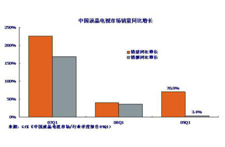 GfK中国发布的《液晶电视产业市场季度报告(09Q1)》显示:2009年1季度,中国液晶电视市场出现了反弹,销量达到476万台,比2008年1季度增长了约70%。