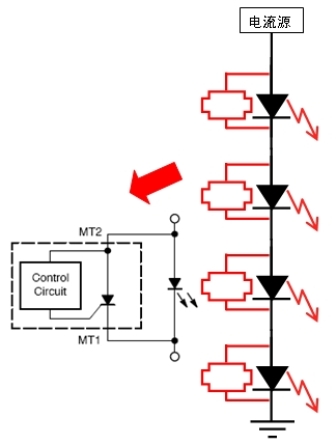 如前所述,LED是一种使用寿命极长的光源(可长达5万小时)。除了需要针对具体的LED应用选择适合的LED驱动解决方案,还需要为LED提供适当的?;ぃ蛭级鸏ED也会失效。其原因多种多样,可能是因为LED早期失效,也可能是因为局部的组装缺陷或是因瞬态现象导致失效。必须对这些可能的失效提供预防措施,特别是因为某些应用属于关键应用(故障?;杀靖?,或是安全攸关的应用(如头灯、灯塔、桥梁、飞行器、飞机跑道等),或是在地理上难于接近的应用(维护困难)等。在这方面,可以采用安森美半导体的NUD4700 LED分流?;そ饩龇桨?。图5是这种分流?;そ饩龇桨傅挠τ眉霸硎疽馔肌?br />