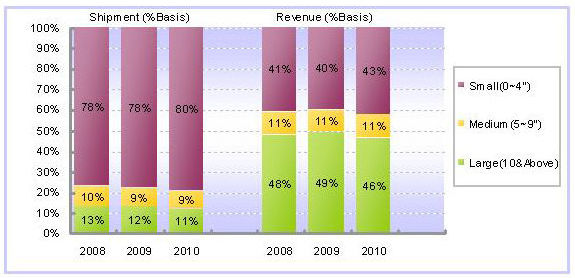 再从出货尺寸别来看,主要触控面板的出货尺寸集中在4寸以下(含4寸),2008年出货量为3亿6,000万片,占整体市场比重将近79%。同样地,受到全球经济衰退的影响,2009年在4寸以下(含4寸)的出货量虽然目前看来将维持与2008年相仿的水准,但到了2010年预计将会有2%的成长幅度。