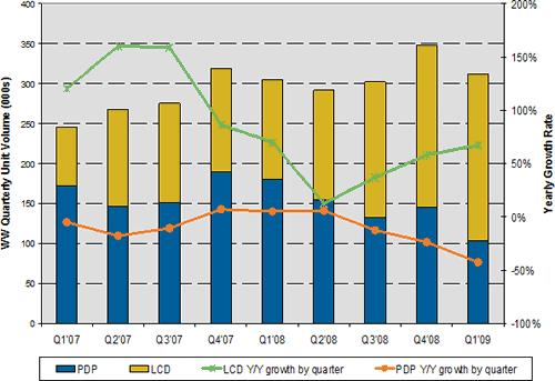 图一 Q1’09全球26寸及以上尺寸公众显示器出货量与成长率 - 按液晶与等离子显示器区分