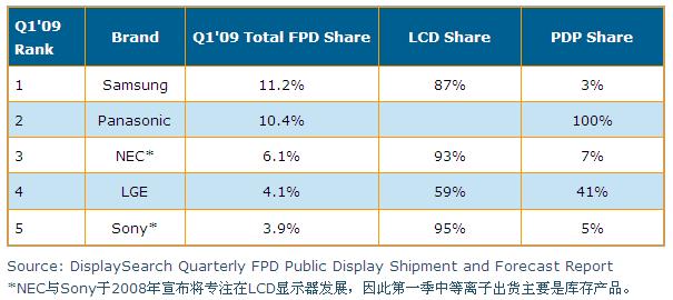 有部分品牌厂商在2008年停止采用等离子面板做为公众显示系统应用,对于等离子阵营造成了一些伤害;不过主要等离子厂商如Panasonic仍是非常专注于等离子面板于公众显示领域的应用,我们相信这些主要厂商的投入,对于等离子未来在公众显示领域的发展仍会有一定影响力。根据DisplaySearch第一季出货调查指出,Samsung为整体公众显示器不分技术别出货冠军,而Panasonic排名第二,不过Samsung主要是采用液晶显示器,而Panasonic则100%采用等离子显示器。