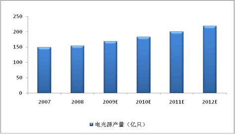 中国电光源(灯泡)行业能够持续快速稳定的发展,其中很重要的原因是产品面向国际和中国两大市场。在中国和国外消费市场推动下,2008年中国电光源产量达154亿只,较2007年同比增长3.5%。随着中国电光源质量和技术标准的提升,预计未来中国电光源产量增长率将为维持9%-12%之间。