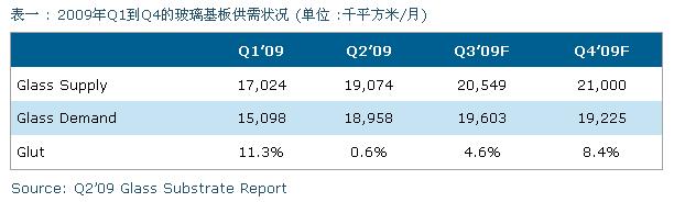 由此份报告中计算出玻璃基板的供需状况(如下表),玻璃基板在2009年第二季每个月平均需求预估超过1千890万平方米,较2009年 Q1成长26%,而玻璃基板的供应状况从第一季到第二季仅成长12%,供应端成长的速度远远赶不及需求的快速成长。
