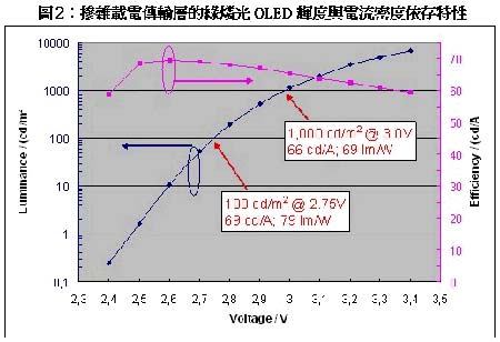 根据实验结果显示,65cd/A与80lm/W(在100cd/m2,2.6V)的绿色磷光OLED,经过doping后的载电荷子传输层(如下图所示),它的内部量子效率(quantumefficiency)可以达到接近100%(相较之下Out-coupling系数只有20%),而且可以获得较佳的亮度,运作电压更接近热力极限。