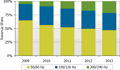 图一 2009~2013 全球30寸及以上尺寸液晶电视按不同倍频技术出货金额比率