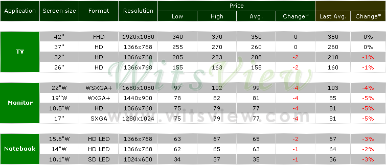 9月份笔记本电脑面板需求受惠于Windows 7新机铺货,下游客户订单量仍维持一定的水准,面板价格有涨有跌,上下幅度约1~2美元,一线品牌客户价格压力较大,在10月的面板需求将较9月份减少的影响下,估计面板价格跌幅将扩大至2-3美元;9月份液晶电视面板价格则大致维持稳定,小尺寸26W及32W面板在少数客户端的价格微幅下调2~3美元,40W以上则大都持平,大陆十一国庆长假的销售成为市场关注的焦点,销售结果将左右10月份电视面板价格的走势,另一方面,由于监视器面板产能已经松动,因此估计小尺寸电视价格走势将受牵连,下跌幅度约5-10美元。