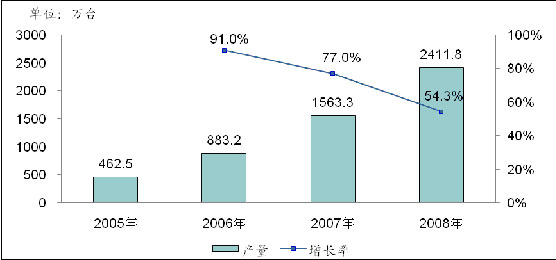 随着传统CRT彩电的逐渐被取代,液晶电视的普及已经成为不可逆转的趋势,并且普及的速度在不断加快。中国作为全球最大的彩电制造基地和彩电消费市场,在彩电工业的转型过程中,液晶电视的产量也出现了爆发式的增长。根据赛迪顾问统计,2005年-2008年,中国液晶电视产量的年均复合增长率高达73.4%,2008年产量达到2411.8万台。