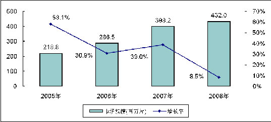 2008年受全球金融危机的影响,液晶面板的市场需求量出现大幅萎缩。2008年全球大尺寸(大于10英寸)TFT-LCD面板销售量达到4.32亿片,比去年3.98亿片的销售量仅仅增长8.5%,远低于2007年39.0%的增长率,创近5年市场增长率最低。