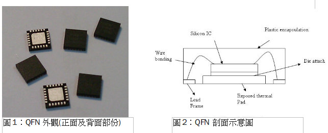 四侧无引脚扁平封装,表面贴装型封装之一,是一种底部有焊盘、尺寸小、体积小、以塑料作为密封材料的新兴表面贴装芯片封装技术。由于QFN封装不像传统的SOIC封装那样具有鸥翼状引线,内部引脚与焊盘之间的导电路径较短,所以自感係数以及封装体内佈线电阻很低,所以它能提供卓越的电性能,也因为没有鸥翼状引线更能减少所谓的天线效应进而降低整体的电磁干扰(EMC/EMI)。