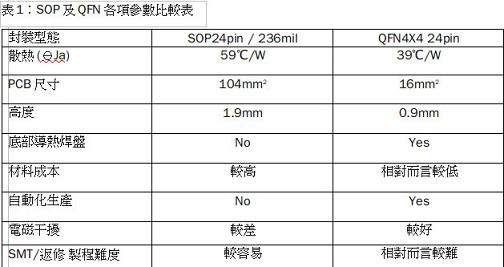 一般在使用的SOP其尺寸为104mm2(8X13x1.9mm),而QFN相对的尺寸只有16mm2(4X4X0.9mm)只有SOP的6~7分之一的尺寸;在做一些小间距的显示屏设计上具有更大的弹性。