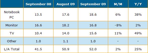 以下摘录DisplaySearch 9月份液晶面板出货数据调查部份重点: