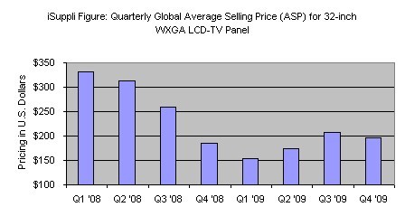 32英寸WXGA LCD电视面板可以代表市场趋势,预计它在第四季度的平均价格是196美元,比第三季度时的208美元下降5.8%。