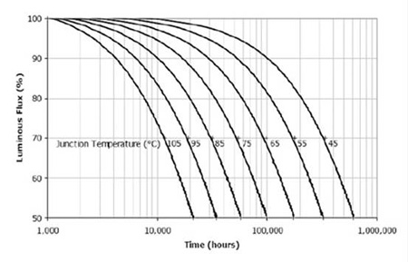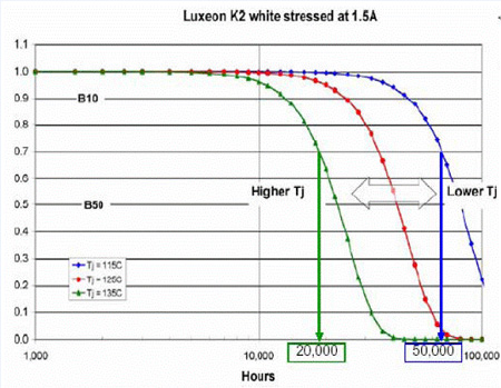 当结温从115℃提高到135℃,就会使寿命从50,000小时降低到20,000小时。其他各家公司的光衰曲线应当可以向原厂索取。