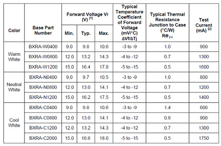 假定对LED以Io恒流供电,在结温为T1时,电压为V1,而当结温升高为T2时,整个伏安特性左移,电流Io不变,电压变为V2。这两个电压差被温度去除,就可以得到其温度系数,以mV/oC表示。对于普通硅二极管,这个温度系数大约为-2mV/oC。但是LED大多数不是用硅材料制成的,所以它的温度系数也要另外去测定。幸好各家LED厂家的数据表中大多给出了它的温度系数。例如对于Cree公司的XLamp7090XR-E大功率LED,其温度系数为-4mV/oC。要比普通硅二极管大2倍。至于美国普瑞的阵列LED(BXRA)就给出了更为详细的数据。