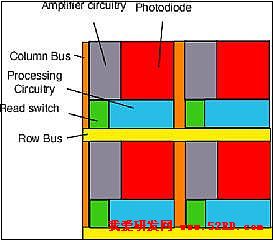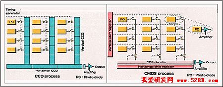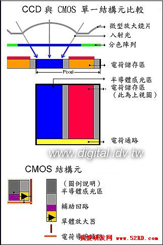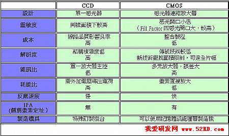 CCD与CMOS电路结构之完整比较(摘录自SHARP月刊)差异分析整体来说,CCD与CMOS两种设计的应用,反应在成像效果上,形成包括ISO感光度、制造成本、解析度、杂讯与耗电量等,不同类型的差异:ISO感光度差异:由于CMOS每个画素包含了放大器与A/D转换电路,过多的额外设备压缩单一画素的感光区域的表面积,因此在相同画素下,同样大小之感光器尺寸,CMOS的感光度会低于CCD?!?br />