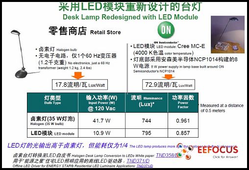 在现场,Laurent Jenck 展示了两款从零售商店购得的卤素台灯(采用35 W灯泡)。一款采用原卤素灯,另外一款则采用了安森美NCP1014芯片进行稳压改进。原卤素灯在120 Vac条件下的输入功率为41.7 W,在0.5米距离处测得的光亮度为744流明。采用了自供电单片式开关稳压器的台灯在120 Vac条件下输入功率为10.9 W,即能耗仅相当于卤素灯的1/4;同时,这LED台灯在同等距离条件下测得的光亮度为795流明,更优于卤素灯,其72.9流明/瓦(lm/W)的能效(efficacy)更是数倍于卤素灯(17.8 lm/W)。