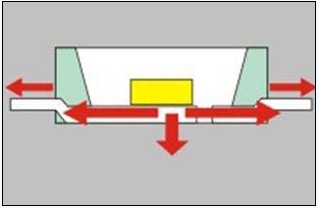 传统贴片产品,虽能通过芯片的金线联接正负极,同时也是让芯片产生的热能过金线连接至银脚,热与电的传导均是由金钱传导的,热的积累时间长了会直接影响LED日光灯管的寿命。
