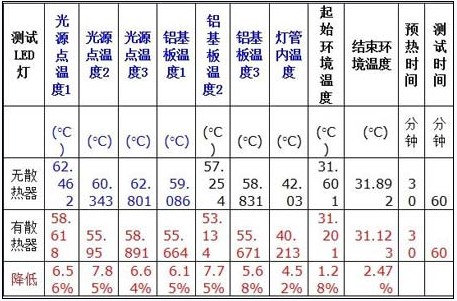 热传导的途径有三种,对流、传导及辐射。在封闭的环境中,对流及传导实现的可能较小,而通过辐射将热散发出来,是日光灯管考虑的重点。以下是我们做的LED日光灯管的测试数据,在LED银脚焊点外测出的温度才58度。