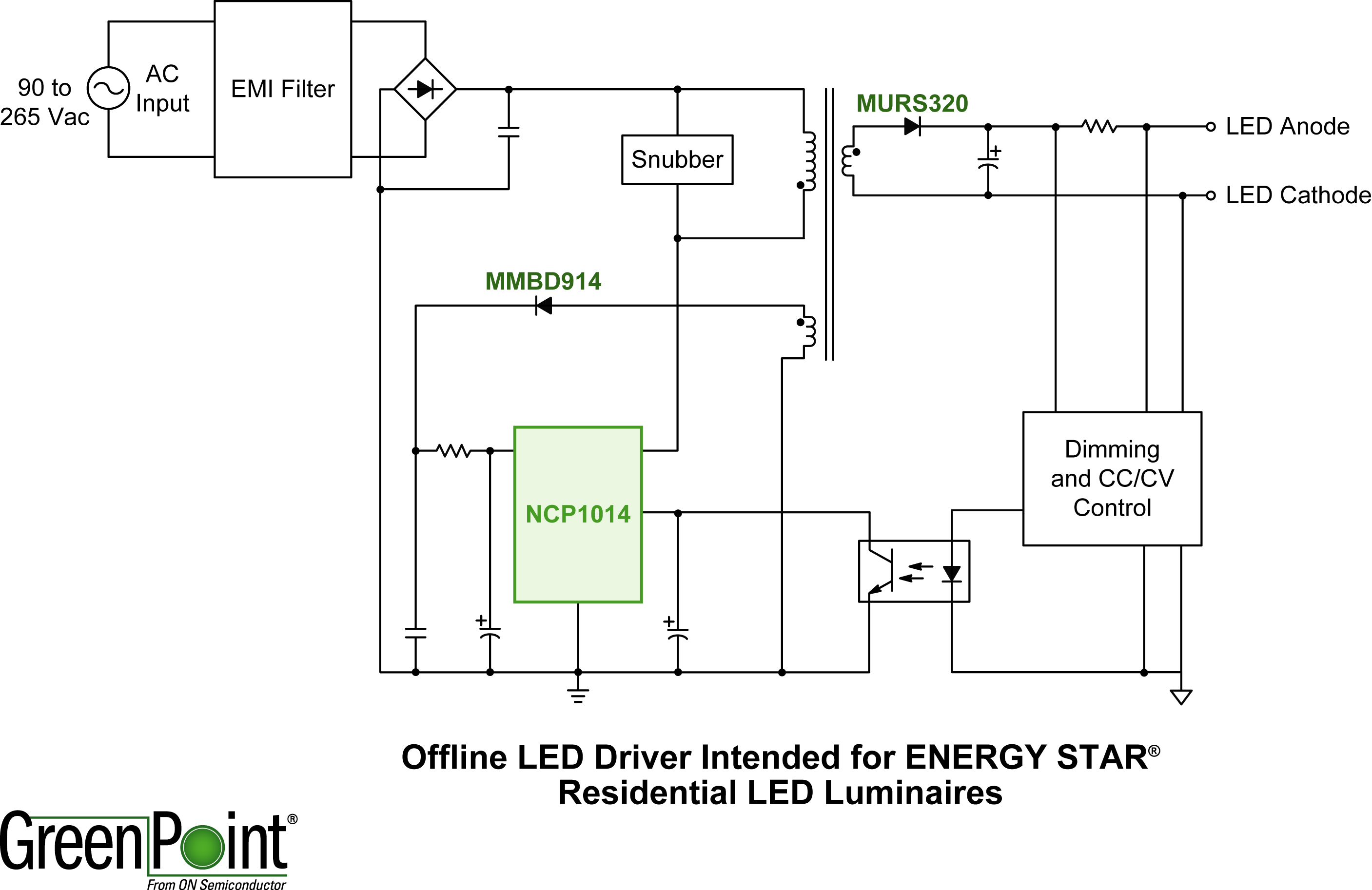 安森美半导体的另一款针对“能源之星”住宅LED照明的离线型LED驱动器GreenPoint®参考设计经过优化,驱动便携台灯、橱柜内照明及户外走廊灯等应用中的1到8颗大功率LED。这参考设计采用新颖的电路配置,无须增加额外的无源功率因数校正(PFC)网络,即可在115 Vac条件下提供高于0.85的功率因数,减少了元器件数量,并轻松满足住宅LED应用功率因数要求。这设计支持90 Vac至265 Vac的通用输入电压工作,采用安森美半导体集成了固定频率电流模式控制器和700 V MOSFET的NCP1014开关稳压器集成电路(IC)。