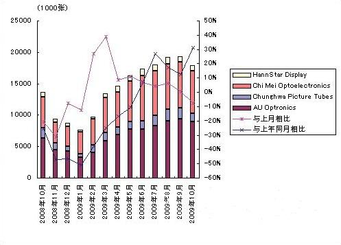 2009年10月台湾四大型液晶面板厂商的大尺寸液晶面板供货量比上月减少7.5%,为1788万块。原因是显示器用液晶面板的负增长。虽然电视机用和笔记本电脑用液晶面板的供货量坚挺,但仍无法弥补显示器用面板的减少。其结果,台湾四大型液晶面板厂商的销售额比上月减少了6.8%。这是自2009年1月以来,时隔9个月首次供货量少于上月。