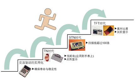 之所以会存在使用寿命和可靠性方面的问题,主要是因为将直流电压加载到液晶上时,液晶材料及电极会发生氧化还原反应而变质。虽然也可以采用交流电来驱动液晶,但是显示性能较差。最终解决这一问题的是夏普公司。该公司发现,如果在液晶材料中加入离子性杂质,使其导电率升高,就可以采用交流驱动获得良好的显示特性。利用这项技术,1973年5 月,夏普公司推出全球首款液晶应用产品—— 使用液晶显示屏作为显示部件的小型计算器EL-805。