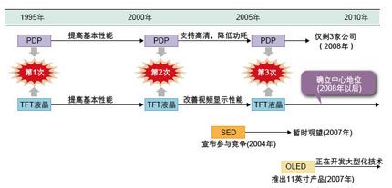在液晶显示器市场刚开始启动的1998年,当时的夏普公司社长(现任董事长)町田胜彦的发言震惊了整个行业。他表示: “到2005年,夏普在日本国内销售的电视将全部采用液晶屏。” 当时,液晶电视并未普及,在夏普公司内部对于彩色液晶屏也并没有十足的把握。但是,这一句话成为液晶电视扫荡市场的导火索,那以后,液晶电视以超乎町田胜彦预想的惊人速度推广开来。在此过程中,液晶与PDP(等离子)、SED(表面传导电子发射显示)等技术展开了激烈的竞争(见图3)。
