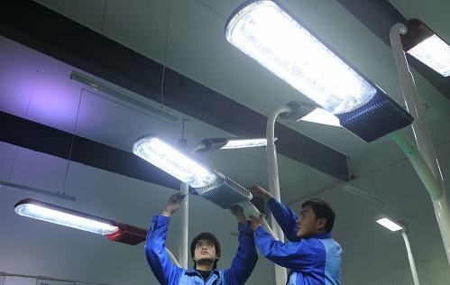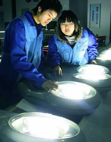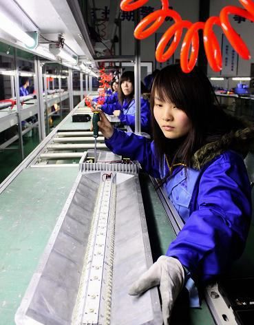 图:天津工业大学海宇半导体照明产业化基地的员工在组装LED照明灯