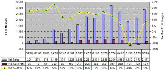 在2009年上半年,生产能力过剩和整个供应链的供过于求,造成太阳能发电系统的平均价格降幅达25%以上。然而低价格的刺激,较为容易的融资环境,以及需求的多样化,加上各个国家及区域新的奖励政策推出,让主要的厂商在2009年第三季顺利转亏为盈。